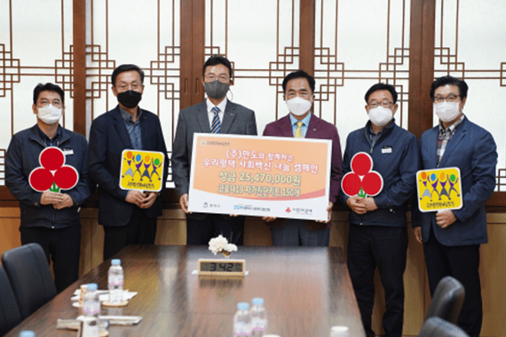 (주)만도에서는 지난 26일 평택시청 대외협력실에서 평택행복나눔본부에 임직원 550여명이 모은 성금 2,547만원과 코로나자가진단키트 150개를 전달했다.
