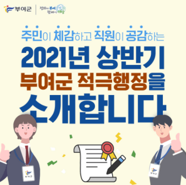 부여군은 주민이 체감하고 직원이 공감하는 적극행정을 추진하기 위해 2021년 상반기 적극행정 우수사례 및 우수공무원을 선발했다고 밝혔다.