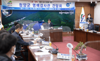 청양군이 지난 26일 군청 2층 상황실에 각 읍면 명예감사관 10명이 참석한 가운데 2021년 하반기 명예감사관 간담회를 열고 상반기 개선사항에 대한 처리결과에 의견을 나눴다.