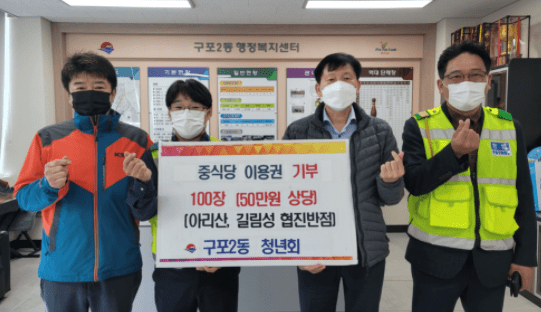 부산 북구 구포2동 행정복지센터는 구포2동 청년회가 코로나19로 경제적으로 힘들어진 저소득 취약계층을 대상으로 50만원 상당의 중식이용권을 무료로 지원한다고 26일 밝혔다.
