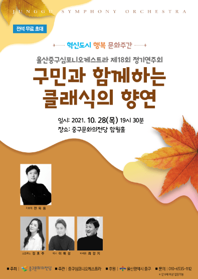 중구심포니오케스트라가 오는 10월 28일 저녁 7시 30분 중구문화의전당 함월홀에서 ‘구민과 함께하는 클래식의 향연’을 개최한다.