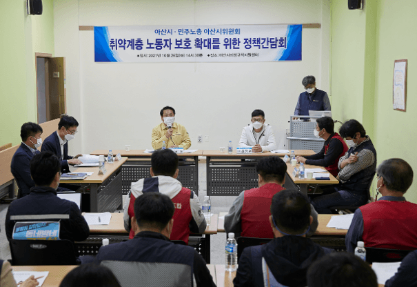 이날 아산시와 민주노총은 취약 노동자들의 인권 보호 확대를 위해 아산시비정규직지원센터의 ▲2022년도 예산 증액 ▲상주 근무 인력의 증원 ▲접근성과 편의성을 갖춘 공간 마련 등에 대해 논의했다.
