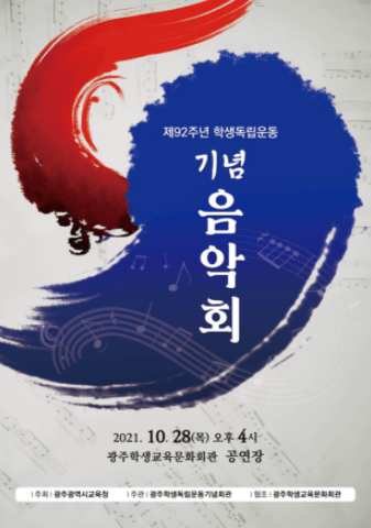 26일 광주학생독립운동기념회관에 따르면 이번 기념음악회는 학생 참여형 공연으로 진행된다. 광주시교육청, 광주학생독립운동기념회관, 광주학생교육문화회관이 기획·공연·운영팀으로 업무를 분담했고, 공동 협력해 기획했다. 관내 중·고등학교 학생 문화예술동아리 및 단체의 참가 신청을 받아 6개 팀(총 149명)이 선정됐다. 광주광역시교육청과 광주학생독립운동기념회관, 광주학생교육문화회관이 기획·공연·운영팀으로 업무를 분담하고 공동으로 기획했다.