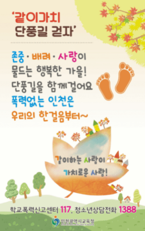 인천광역시교육청은 ‘폭력없는 인천, 생명존중 인천’을 위한 학교폭력예방 걷기 캠페인 ‘같이가치 단풍길 걷자’를 11월 14일까지 실시한다.