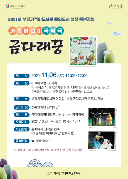 인천시 부평구 부평기적의도서관은 오는 11월 6일 도서관 내 어울림에서 ‘법정 문화도시 부평’ 기념 특별공연 가족어린이국악극 ‘금다래꿍’을 무대에 올린다.