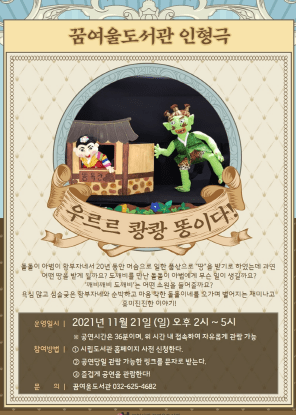 부천시립꿈여울도서관은 11월 21일 ‘우르르 쾅쾅 똥이다!’ 온라인 인형극을 진행한다.