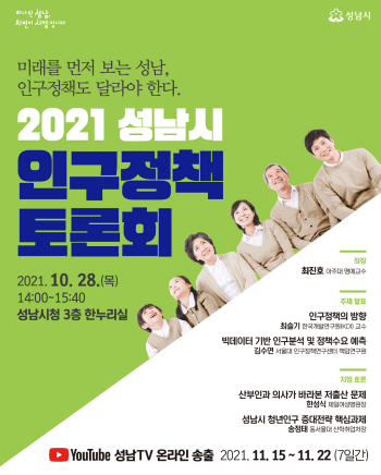 성남시는 오는 10월 28일 오후 2시 시청 3층 한누리에서 인구정책에 관한 전문가 토론회를 연다.