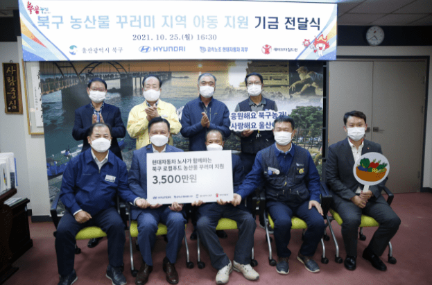 울산 북구는 25일 구청장실에서 현대자동차 노사와 세이브더칠드런 관계자 등이 참석한 가운데 취약계층 아동에게 지역 농산물 꾸러미를 전달하는 기금 전달식을 가졌다.