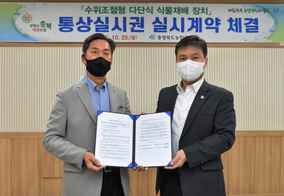 충북농업기술원은 25일, 농업기술원 창조농업실에서 ㈜장자동화와 재배가 쉽고 생산량은 획기적으로 높이며 양액 낭비 없이 친환경적으로 재배 가능한 “수직 다단식 스마트 재배 장치” 기술에 대한 통상실시 계약을 체결했다.