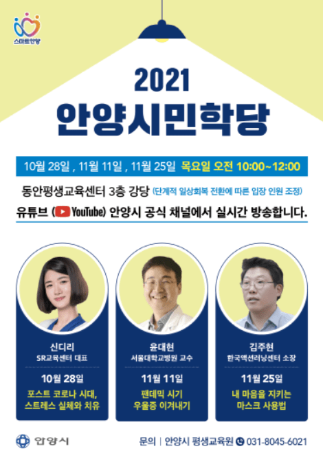 코로나19로 지친 마음을 치유하는 방법을 담은 이번 안양시민학당은 코로나블루로 어려움을 겪는 시민들에게 따뜻한 위로의 시간이 될 전망이다.