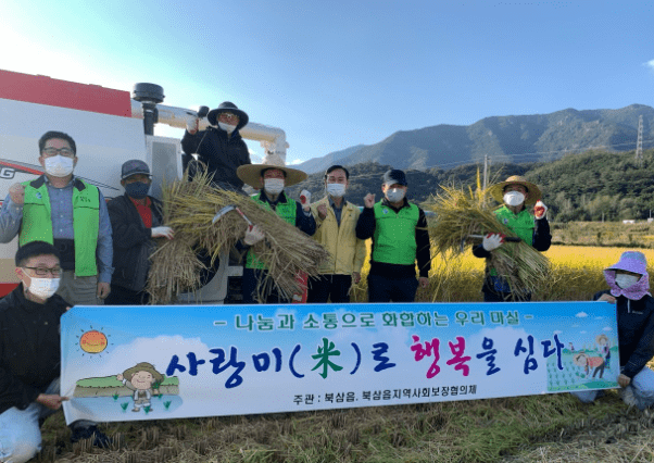 칠곡군 북삼읍 지역사회보장협의체는 지난 22일에서 지난 5월에 심어 놓은 백진주미 추수 행사를 실시했다.