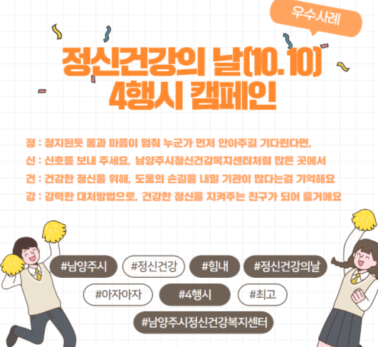 남양주시 정신건강복지센터는 2021년 정신건강의 날(10. 10.)을 맞아 진행한 정신건강의 날 기념행사 ‘4행시 캠페인’이 성황리에 마무리됐다고 25일 밝혔다.