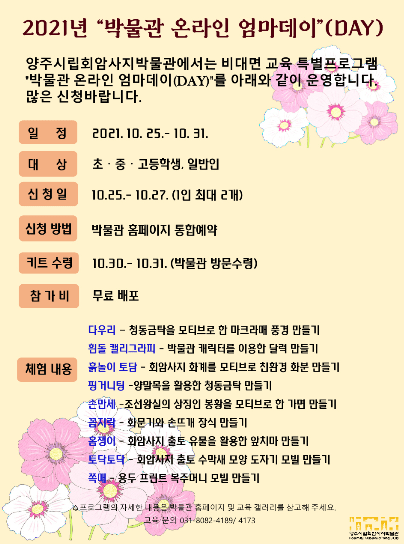 양주시립회암사지박물관은 25일부터 31일까지 비대면 교육 특별프로그램 ‘박물관 온라인 엄마데이(DAY)’를 운영한다.