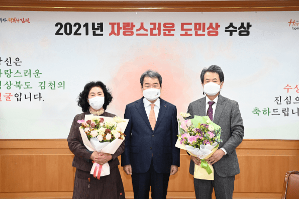김천시는 지난 22일 경북도청 화백당에서 진행된‘2021년 자랑스러운 도민상 시상식'에서 김천제일병원 강병직 이사장, 대도중공업(주) 백계자 대표이사가 ‘2021년 자랑스러운 경북도민상'을 수상했다고 밝혔다.
