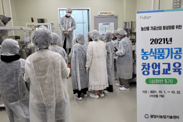 광양시 농식품 가공 창업교육은 농산물가공센터 가공 핵심인력 육성과 지역 농산물 이용 가공산업 활성화를 목표로 2016년 1기를 시작으로 기초와 심화 2개 과정으로 운영되며, 농산물 가공에 관심 있는 광양시민에게 다양한 농식품 가공 관련 정보를 제공하고 있다.