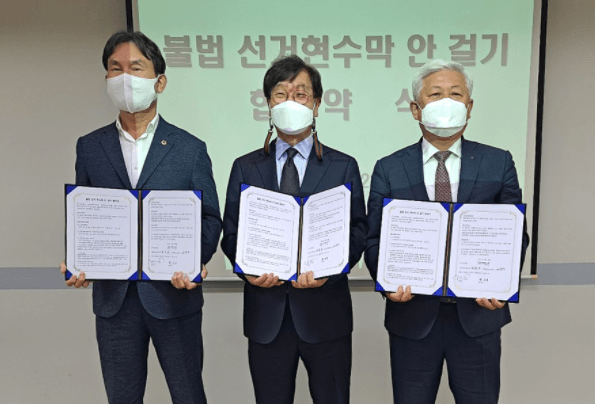 이날 무주군수 출마예정자 등이 서명한 선거 현수막 사용 자제를 위한 협약서에는 △본인 명의의 선거 현수막 게시 금지와 함께, △자치단체가 선거 현수막을 곧바로 철거해도 항의하지 않겠다는 조항이 포함됐다.
