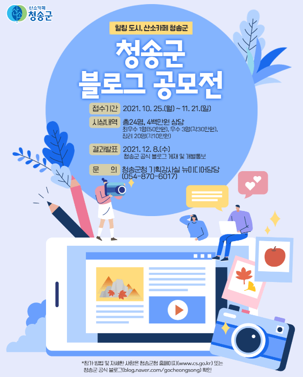 청송군은 "산소카페 청송군”의 도시브랜드 홍보를 위해 ‘힐링 도시, 산소카페 청송군’을 주제로 「2021 청송군 블로그 공모전」을 개최한다.