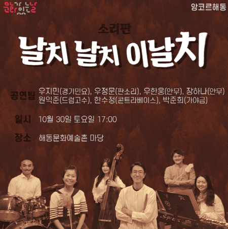 문화가 있는 날 ‘앙코르 해동’ 10월 공연이 오는 30일 17시 담양 해동문화예술촌 마당에서 열린다.
