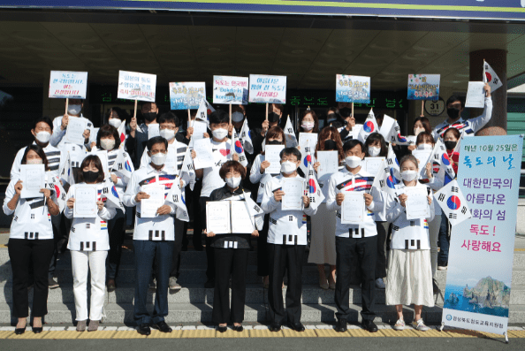 경상북도청도교육지원청은 10월 25일 독도의 날을 기념해 청도교육지원청 전직원이 ‘사이버독도학교’를 수료 후 독도티셔츠를 입고 수료증 인증샷을 찍으며 독도사랑을 온몸으로 실천하였다.