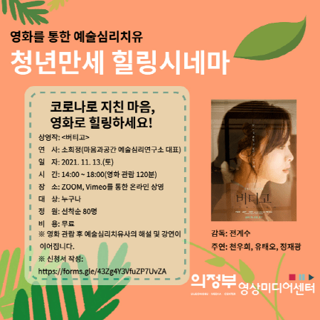 11월 13일 토요일 14:00부터 18:00까지 진행되는 이번 힐링시네마는 Vimeo, Zoom 등 온라인 플랫폼을 통해 비대면으로 진행되며, 영화 '버티고'를 관람한 후 심리치유사의 강연이 이어진다.