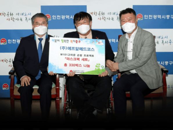 인천 중구는 지난 22일 ㈜에프알메드코스에서 중구의 사회복지종사자들에게 도움이 되고자 마스크팩 세트 330박스를 나눔했다고 밝혔다.