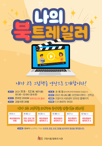 고양시 대화도서관이 미디어·독서 융합 프로그램 「나의 북트레일러」을 11월 9일부터 12월 14일까지 운영한다.