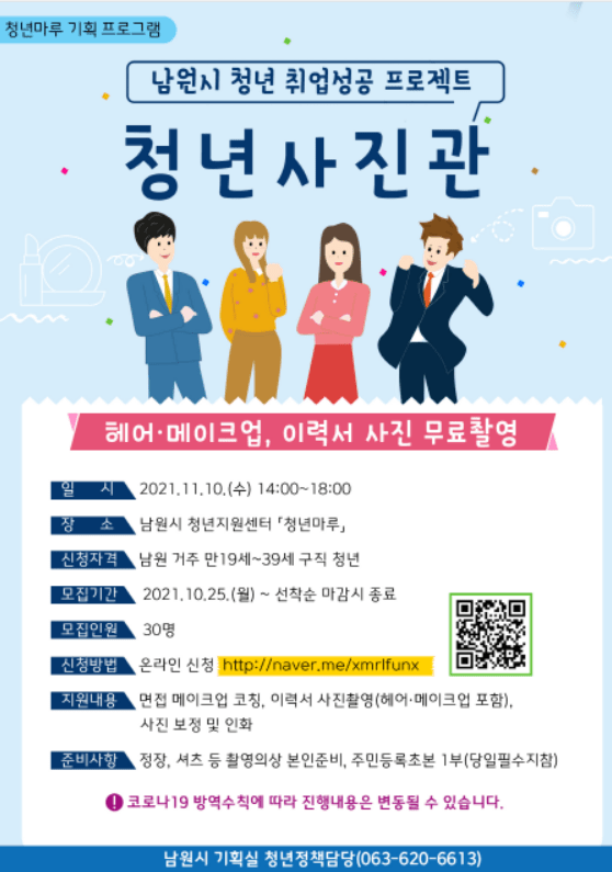 「청년사진관」 사업은 취업을 준비하는 청년들의 희망 직무에 맞는 헤어와 메이크업 연출법을 코칭해주고, 전문 작가가 촬영하고 보정·인화한 이력서용 사진을 제공하는 사업으로 남원시에 거주하는 만19세~39세 구직 청년 30명을 대상으로 11월 10일 오후 2시부터 6시까지 남원시 청년지원센터 ‘청년마루’(공동체지원센터 2층)에서 진행될 예정이다.