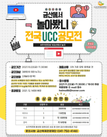 전 국민을 대상으로 금산의 관광 매력을 알리는 금산에서 놀아봤니 UCC 공모전이 개최된다.