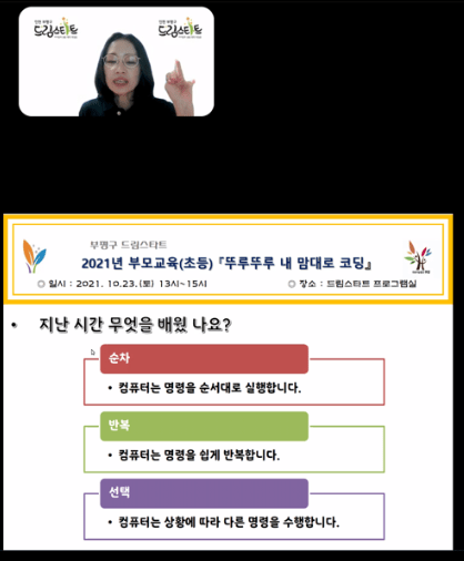 인천시 부평구 드림스타트팀은 지난 16일과 23일 2회에 걸쳐 드림스타트 사례관리 초등학교 저학년 및 양육자 20명을 대상으로 부모교육 ‘뚜루뚜루 내 맘대로 코딩’을 진행했다.