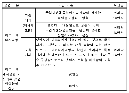 한편, 환경부는 시군별 야생멧돼지 포획포상금 지방비 지급금액 차이로 인해 포획포상금을 더 받으려는 일부 엽사의 부정행위가 야생멧돼지 임의이동을 유발할 요인으로 작용한다고 보고 관계부처 및 시도와 협의하여 시군별로 다르게 지급되는 포획포상금을 동일하게 지급하는 방안도 추진한다.