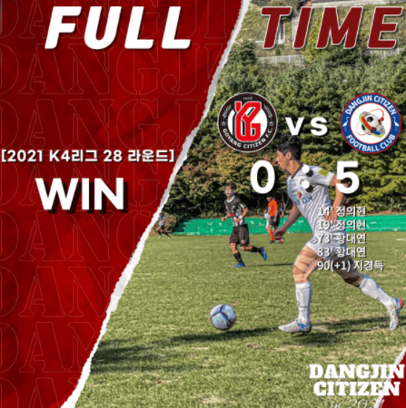 2021시즌 K4리그 28라운드 경기가 국가대표 훈련장인 파주NFC에서 홈팀인 고양시민축구단과 원정팀인 당진시민축구단의 경기가 진행되었다. 23일 토요일 오후2시에 진행된 고양시민축구단과의 원정경기에서 5:0의 시원한 승리로 기쁨을 누렸다.