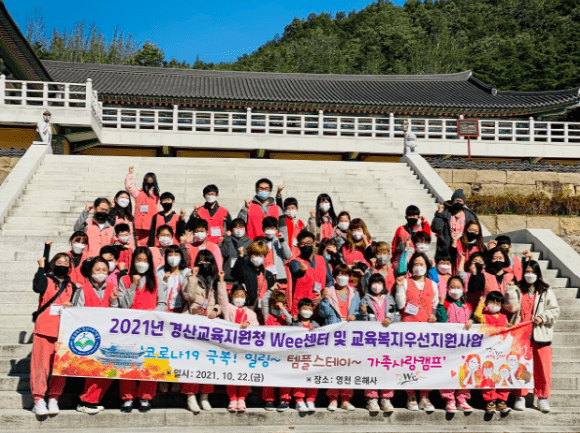 경산교육지원청 Wee센터는 2021년 10월 22일, 영천 은해사에서 경산관내 초·중학생 및 학부모 44명을 대상으로 경산교육지원청 Wee센터 특색 사업인 ‘경산교육지원청 Wee센터 및 교육복지우선지원사업이 함께하는 코로나19 극복! 힐링~ 템플스테이~가족사랑캠프’를 진행하였다.