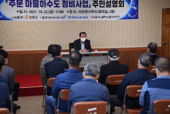 유천호 군수는 22일 서도면사무소 회의실에서 ‘주문 마을하수도 정비사업’ 청사진을 주민들에게 직접 설명하고 의견을 청취했다. 이어서, 함께 참석한 박용철 군의원, 이수근 한국농어촌공사 강화옹진지사장, 이만식 경인북부수협 조합장, 황의환 서강화농협 조합장과 함께 ‘서도면 단기 발전계획’에 대해 지역 주민들과 격 없이 논의했다.