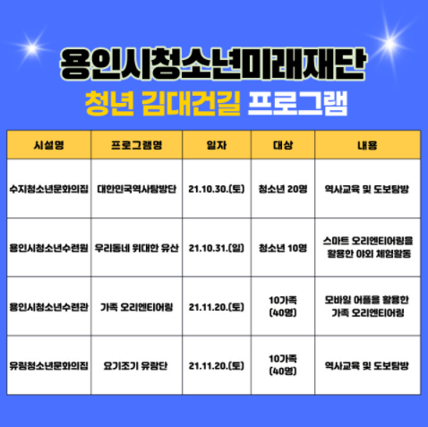 용인시청소년미래재단은 재단 산하 4개 시설(수지청소년문화의집, 용인시청소년수련관, 용인시청소년수련원, 유림청소년문화의집)이 용인에 위치한 청년 김대건길에서 청소년 활동 프로그램을 진행한다고 밝혔다.