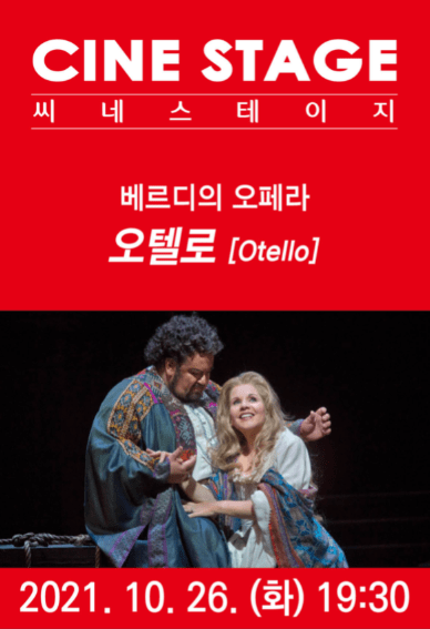 공연예술계의 최신 트렌드, ‘영상으로 즐기는 명작무대’라는 콘셉트로 중구문화의전당이 2019년부터 자체기획 프로그램으로 운영 중인 ‘씨네 스테이지(Cine Stage)’의 올해 열 번째 작품 베르디의 오페라 '오텔로'가 10월 26일 저녁 7시 30분 2012 미국 뉴욕 메트로폴리탄 오페라단 공연 실황으로 상영된다.