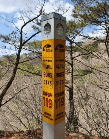 진안군이 등산객 및 안전 확보를 위해 운장산과 부귀산 등 주요 등산로 100개소에 국가지점번호판을 활용한 스마트 조난신고 시스템을 구축한다.