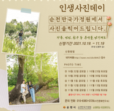 순천시는 10월 22일부터 11월 20일까지 매주 금·토요일에 인생사진데이를 운영하여 방문객들 대상 촬영서비스를 제공한다.