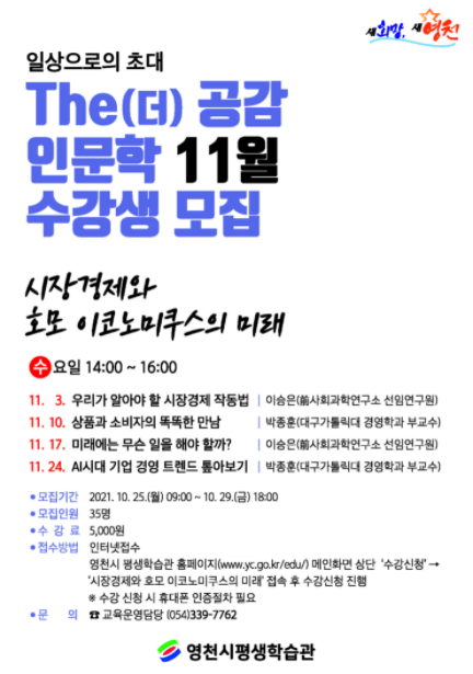 영천시가 전문가들을 초빙 주제가 있는 인문학 콘서트 형식으로 진행하는 ‘The(더) 공감 인문학’ 11월 특강이 ‘시장경제와 호모 이코노미쿠스의 미래’ 이야기로 매주 수요일 4차례 시민들을 찾아간다고 22일 알렸다.