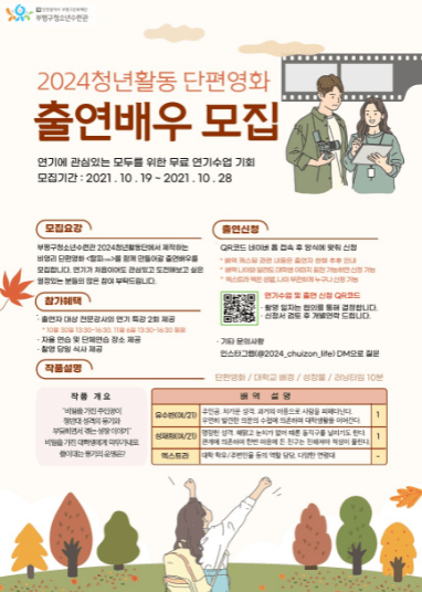 부평구청소년수련관이 오는 28일까지 ‘2024청년활동’ 단편영화 제작 프로젝트의 배우를 모집한다.