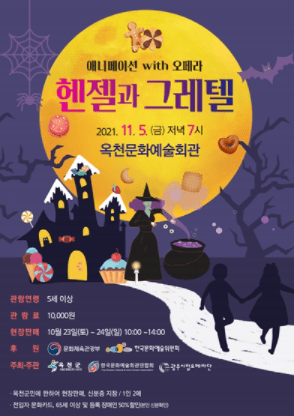 옥천군은 문화예술회관에서 11월 5일 저녁 7시에 2021년 문예회관과 함께하는 방방곡곡 문화공감 공모사업 선정 작품인 ‘애니메이션 with 오페라 헨젤과 그레텔’을 공연한다고 밝혔다.