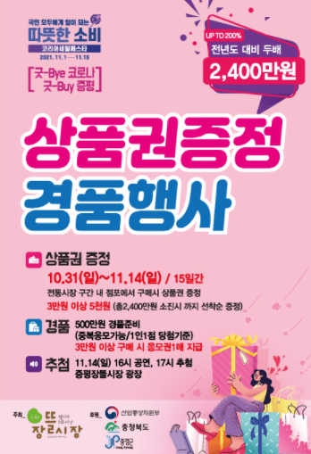증평군이 장뜰 전통시장 활성화를 위해 3만원 이상 구매고객에게 온누리 상품권을 지급하는 페이백 행사‘굿-Bye 코로나 굿-Buy 증평’을 연다.