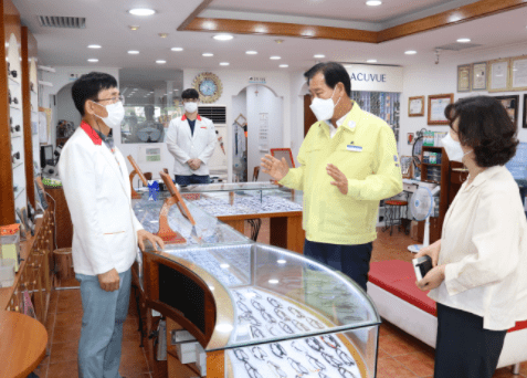 김재종 군수가 청년 소상공인 점포를 방문하여 주민 의견을 듣고 있다