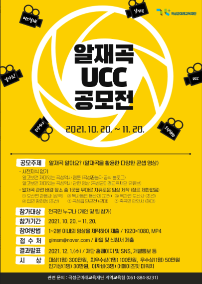 곡성군미래교육재단에서는 10월 20일부터 11월 20일 한달간, ‘알재곡 UCC 공모전’을 개최한다.