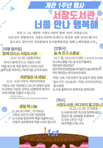 양산시립서창도서관이 개관 1주년을 맞아 지역민과 함께 1주년을 축하하는 다양한 행사를 운영한다. 지역민의 독서에 대한 관심 증대와 도서관 이용 활성화를 위한 기념행사는 오는 11월 5일부터 30일까지 총 5개의 프로그램이 마련된다.