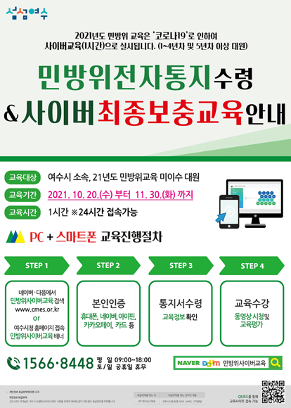 여수시는 이달 20일부터 11월 30일까지 2021년 민방위대원 사이버 최종보충교육을 실시한다고 밝혔다.