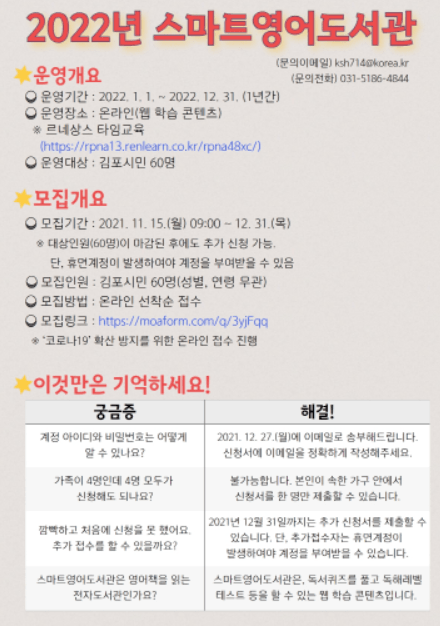 김포시 고촌도서관은 2022년 1월 1일부터 2022년 12월 31일(1년간)까지 「2022년 스마트영어도서관」을 운영한다.
