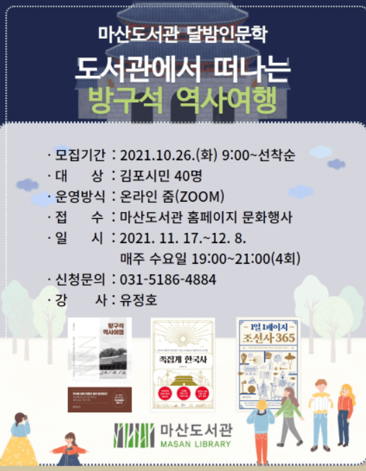 김포시 마산도서관은 11월 17일부터 12월 8일까지 매주 수요일 오후 7시부터 9시까지 총 4회에 걸쳐 「도서관에서 떠나는 방구석 역사여행」 강좌를 줌(ZOOM)으로 운영한다.