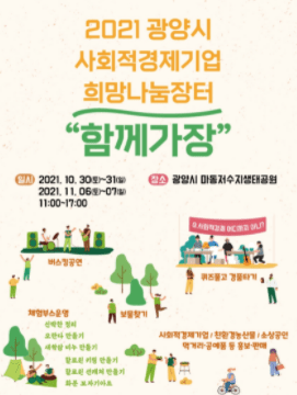 광양시는 코로나19로 어려움을 겪고 있는 지역 내 사회적 경제기업 제품 홍보와 판로 개척을 위한 직거래장터 ‘함께가장’을 오는 30~31일(이틀간) 마동저수지 생태공원에서 운영한다.
