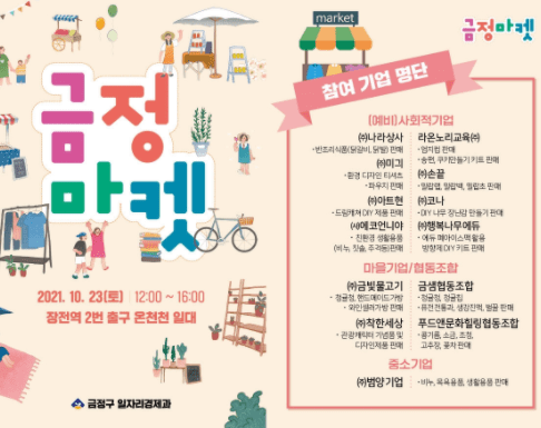 부산 금정구는 오는 23일 12시 부산도시철도 장전역 2번 출구 아래 온천천 일원에서 ‘2021 사회적경제 금정마켓’을 개최한다고 밝혔다.