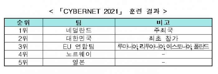 국방부는 네덜란드 사이버사령부가 주최한 국제 사이버 공격 및 방어 훈련인「CYBERNET 2021」에서 준우승을 했다고 밝혔다. 특히, 우리 군이 사이버 분야 국제 훈련에 참가한 것은 이번이 처음이다.